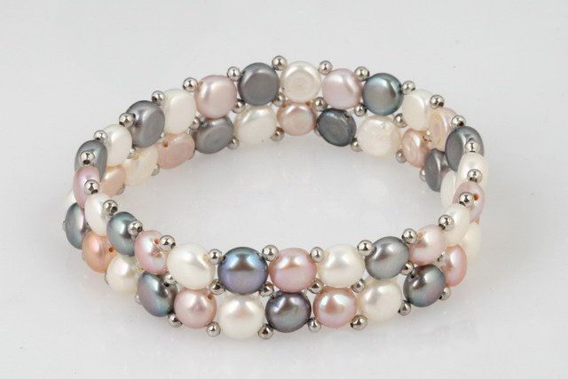 This dazzling and unique multicolor freshwater pearl stretch bracelet, consists of two multicolor rows (white, purple & grey). 7-8mm bread shaped cultured freshwater pearls are strung with silver plated spacer beads on a durable stretch cord. It is super comfortable and is perfect for day or evening wear.