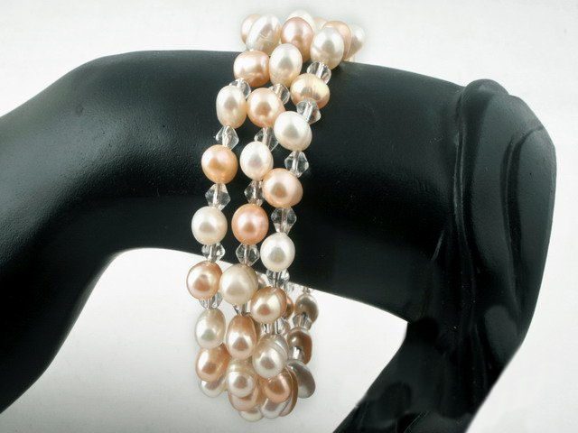 This stunning freshwater pearl bangle bracelet is made of genuine 6-7mm white mix with pink coloured freshwater side drilled pearls. The pearls have a super luster that are adorned with faceted crystal beads. Simply beautiful.