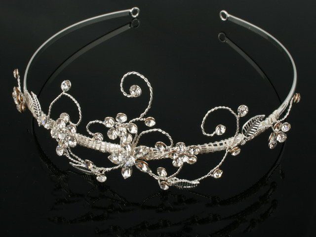 This beautiful tiara is pure elegance. This delightful rhinestone floral pattern adorns this spectacular headpiece. This design measures 15 inches on a silver-toned band and is 2 inches tall in the centre. Pure elegance.