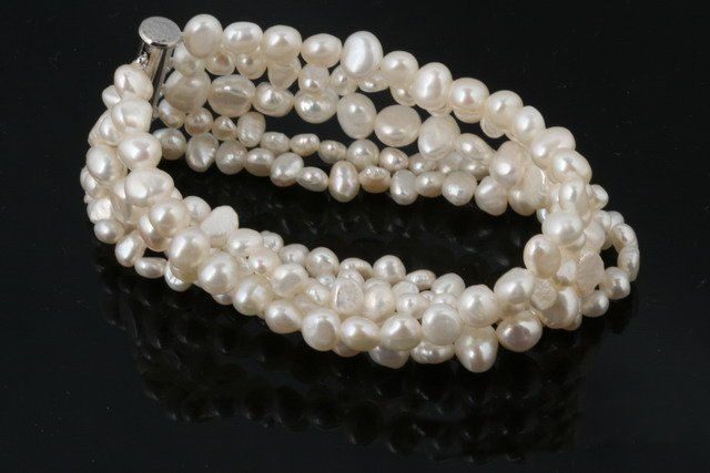 This timeless beautiful gradual pearl bangle/bracelet is hand strung with five strands of 4-5mm to 7-8mm white freshwater nugget pearls and is secured with plated silver slide tube clasp. It is 7.5inches in length.