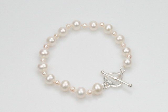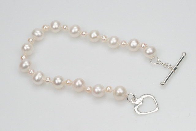 This enchanting freshwater pearl bracelet is hand knotted with 6-7mm alternated 4-5mm freshwater potato pearls. 19cms in length and ends with sterling silver heart shape clasp. Just gorgeous.