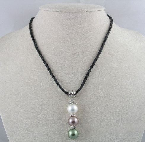 This triple pearl pendant necklace, features three silver plated spacers, alternated with three pieces of round shell pearls, attached to approximately 40cm black This chic necklace features three round shell pearls separated by silver-plated spacers, elegantly strung on a black leather-look cord measuring approximately 40cm with a 5cm extender for the perfect fit. A modern and versatile accessory, presented in a gift box.