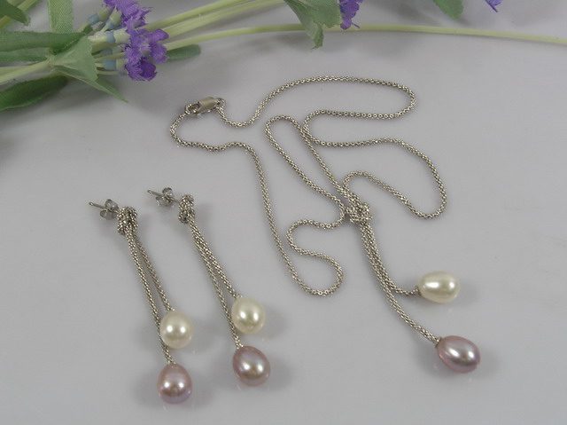 This sophisticated set features a 40cm sterling silver chain elegantly draping 7–9mm white and purple rice-shaped freshwater pearls in a chic lariat-style necklace. A matching pair of sterling silver dangle earrings completes the look, making it perfect for any occasion.