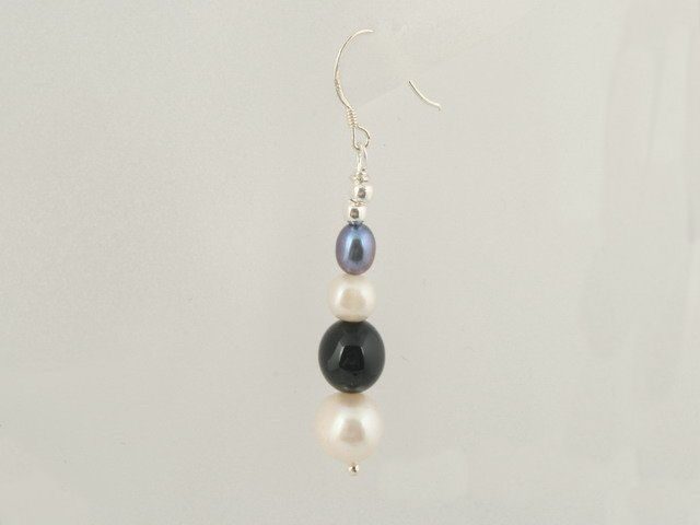These popular earrings feature a captivating blend of 5–6mm and 8–9mm white potato pearls, 5–6mm black rice pearls, and striking 8mm round black agate beads. Suspended from sterling silver ear hooks, they offer a unique and elegant contrast perfect for any occasion