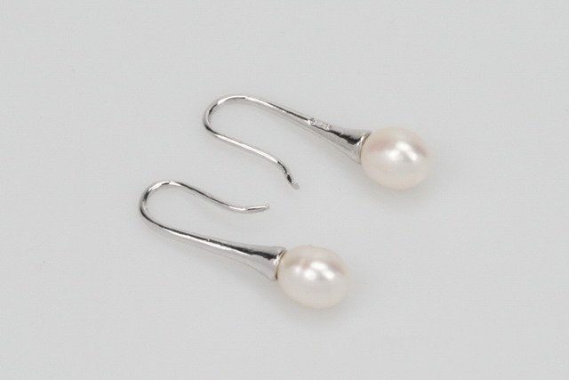 A 6–7mm white rice-shaped freshwater cultured pearl delicately dangles from a sterling silver horn-shaped ear hook, creating a look that’s both elegant and beautiful.