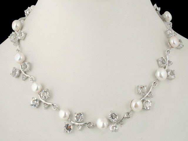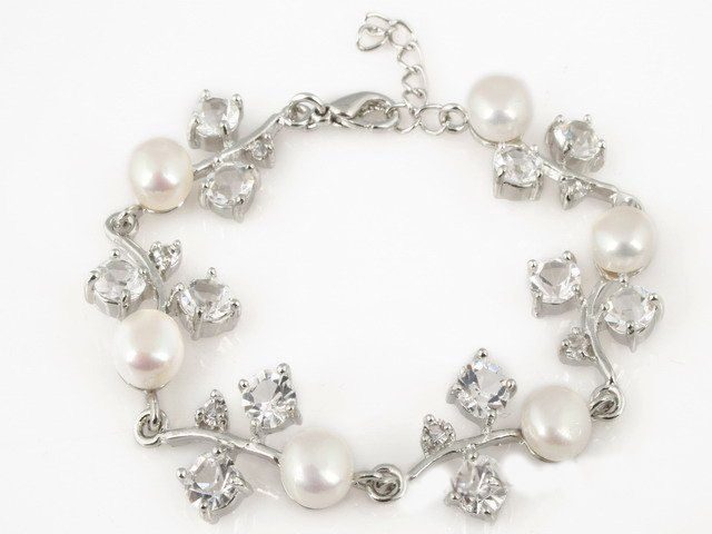 This timeless set includes a 16-inch classic white pearl necklace, a 7-inch matching white pearl bracelet, and coordinating white pearl dangle earrings. Featuring 8–8.5mm white freshwater button (bread) pearls arranged in a stunning leaf-shaped pattern, accented with dazzling white cubic zirconias. All metal components are silver plated, combining classic elegance with a touch of sparkle.