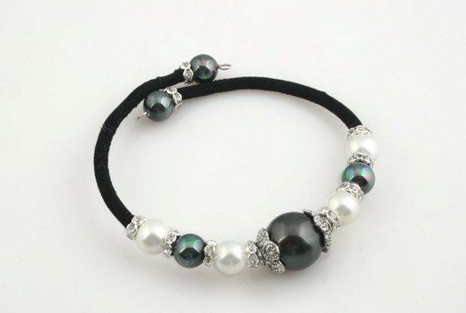 Stylish and modern, this fashionable bracelet features bold 14mm South Sea shell pearls, beautifully alternated with 8mm black and white shell pearls. Set on a sleek black leather-look band, it offers a contemporary twist on classic pearl jewelry.