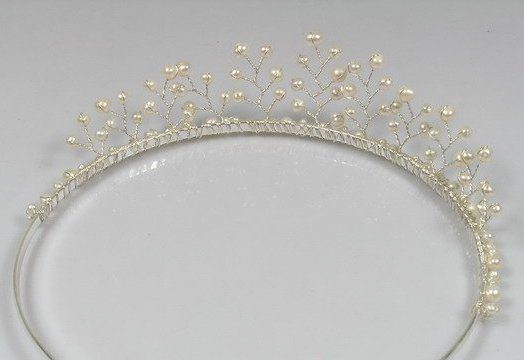 This breathtaking hand-knitted bridal tiara features a silver-plated setting adorned with lustrous 5–6mm and 4–5mm white pearls.