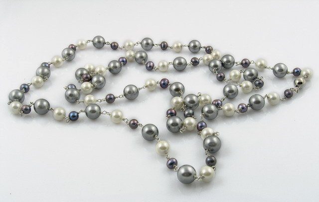 This 120cm long shell pearl necklace is alternately thread with 10mm grey south sea shell pearls, 8mm white south sea shell pearls and 6-7mm black pearls. Simply elegant. An 8mm silver ball clasp holds this elegant necklace at the back. Just beautiful. Comes in an elegant gift box.