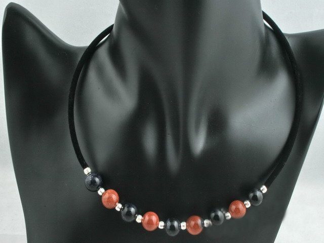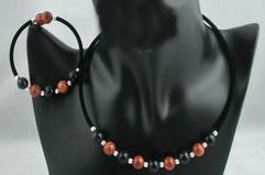 This fantastic set features 10mm sandstone beads alternated with gold sandstone beads, accented by a 4mm solid sterling silver bead at the end for a refined touch. The set includes a necklace and a 19cm bracelet, both designed with a sleek black leather-look cord.