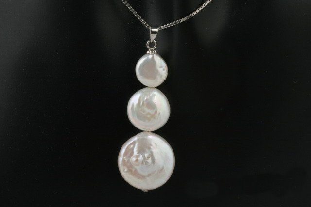 This modern sterling silver pearl pendant is made of three gradual sized (9mm,12mm,16mm) white freshwater coin pearls. Sterling silver clasp.