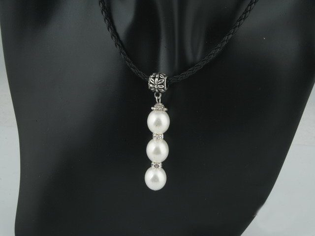 This triple pearl pendant features three silver plated spacer alternated with three 12mm white round shell pearls. 16inch black leather look cord enclosed with 18KGP lobster clasp with a 2 inch extension.