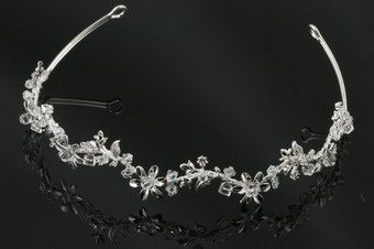This unique tiara exudes grace and tranquility with its free-flowing ribbon design. The silver-toned band gracefully winds up and down, showcasing an intricately woven pattern of delicate silver branches adorned with sparkling rhinestones and faceted crystals.
