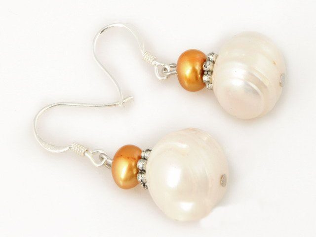 These stunning and unique earrings are made of a 9.5-10.5mm white freshwater whole pearl and a 5-6mm gold potato pearl.