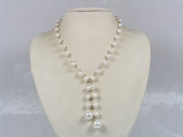 This stylish Y-shaped necklace features 7–8mm white potato-shaped pearls, accented with two strands of pearls and a striking 12mm shell pearl bead at the center. Measuring 17 inches in length, it finishes with a secure silver lobster clasp for comfortable wear.