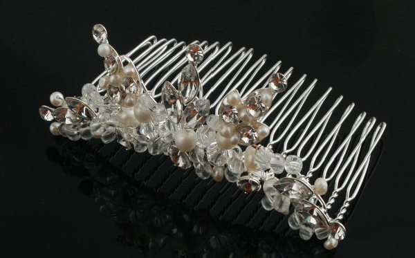 This beautiful bridal comb combines lustrous freshwater pearls with sparkling rhinestones for an understated yet elegant look. The rhinestone design measures approximately 3.5 inches long along a silver-toned comb, with a height of 1.4 inches at the center.